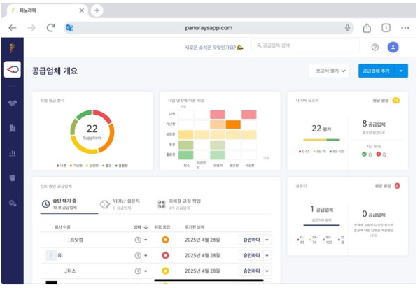 사이버 보안 리스크 관리에 특화된 파노레이즈 솔루션은 SaaS 형태로 공급되며 기업의 공급망 전반에 걸친 제3자 위험 평가를 자동화하고 실시간으로 분석할 수 있는 기능을 제공한다. 전 세계적으로 다양한 산업 분야에서 사용되고 있으며, 직관적인 인터페이스와 뛰어난 리스크 분석 기능으로 주목받고 있다.